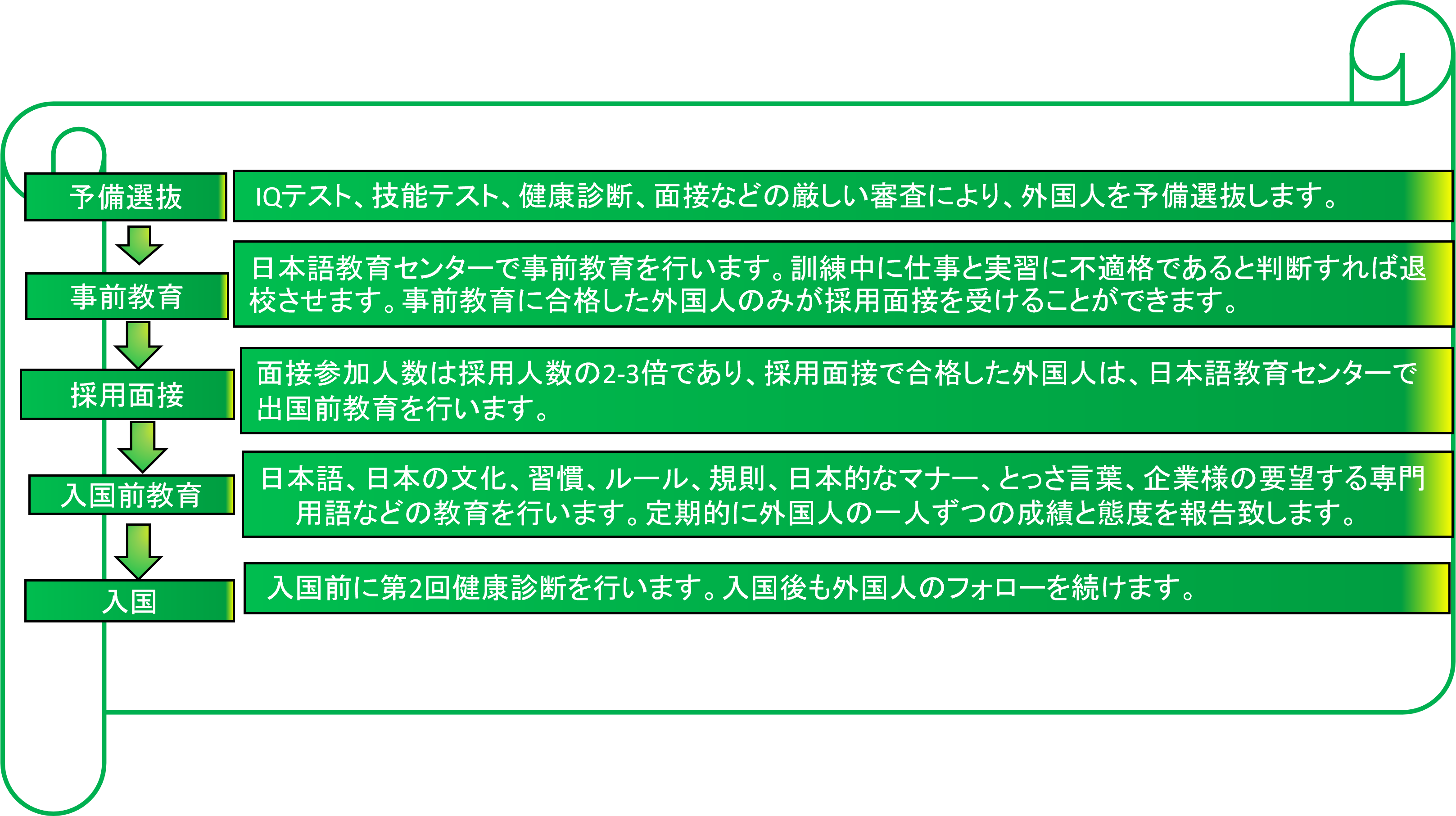 ・新人外国人への援助のためにご支援します。特に外国人が労働能率を高め、努力して学び、経験を積んで企業様と親しくなれるよう緊密にサポートします。
